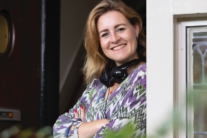 Lachende vrouw staand met armen over elkaar in een deuropening.